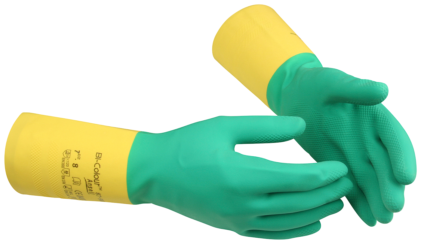 Kemikaalilta suojaava käsine neopreenia/lateksia.