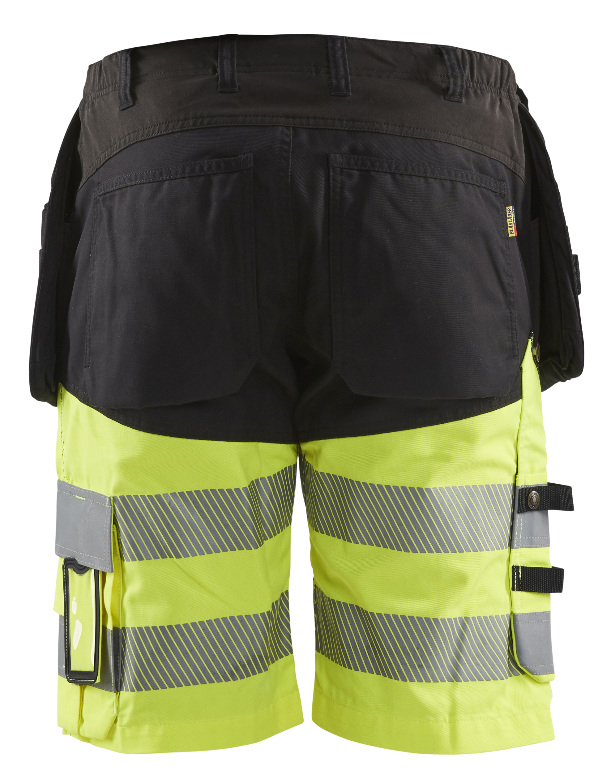 Highvis riipputaskushortsit neljään suuntaan joustavilla osioilla edessä ja takana. Erikoisleveät, CORDURA® -vahvistetut riipputaskut, takataskut ja mittatasku. Katkonaiset heijastimet lahkeissa parantavat liikkuvuutta ja lisäävät näkyvyyttä. Sertifioitu EN ISO 20471, luokka 1.