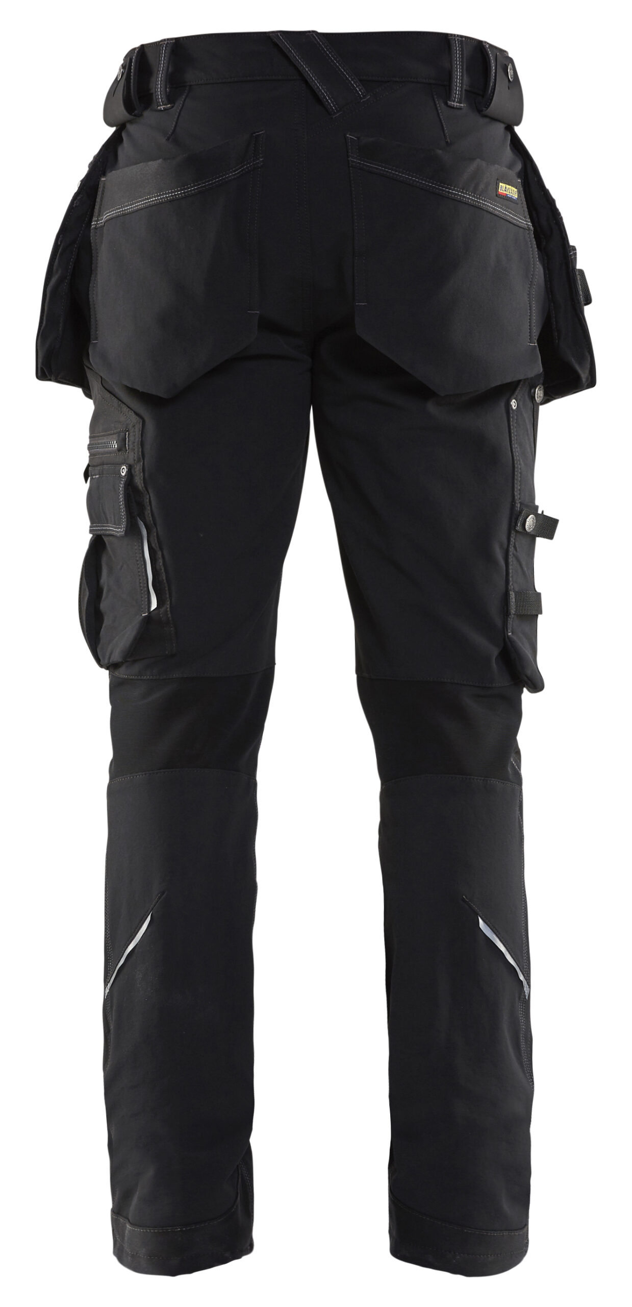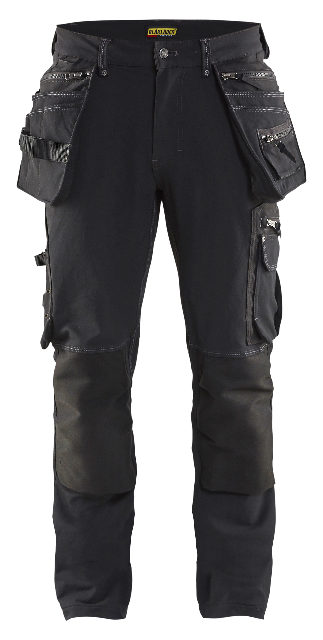Erittäin mukavat ja toiminnalliset riipputaskuhousut 4 suuntaan joustavasta kankaasta. Lahkeet on kapenevat ja erittäin mukavat joustavan ja pehmeän kankaan ansiosta. Housussa on toiminnalliset taskut vahvistuksilla, vetoketjullinen paljereisitasku, mittatasku ja riipputaskut kätevillä työkalulenkeillä. Polvisuojataskut on vahvistettu joustavalla CORDURA®-kankaalla ulkopuolelta ja sisäpuoli on stretch-kangasta liikkuvuuden ja mukavuuden lisäämiseksi. Joustava verkkokangas polvitaipeissa lisää hengittävyyttä. Lahkeensuut on vahvistettu takapuolelta kulumisen estämiseksi.