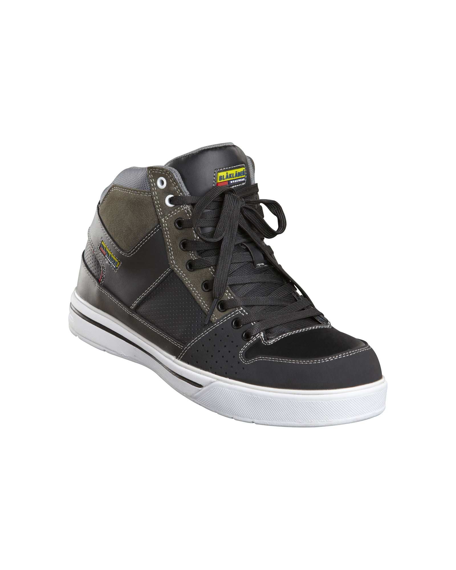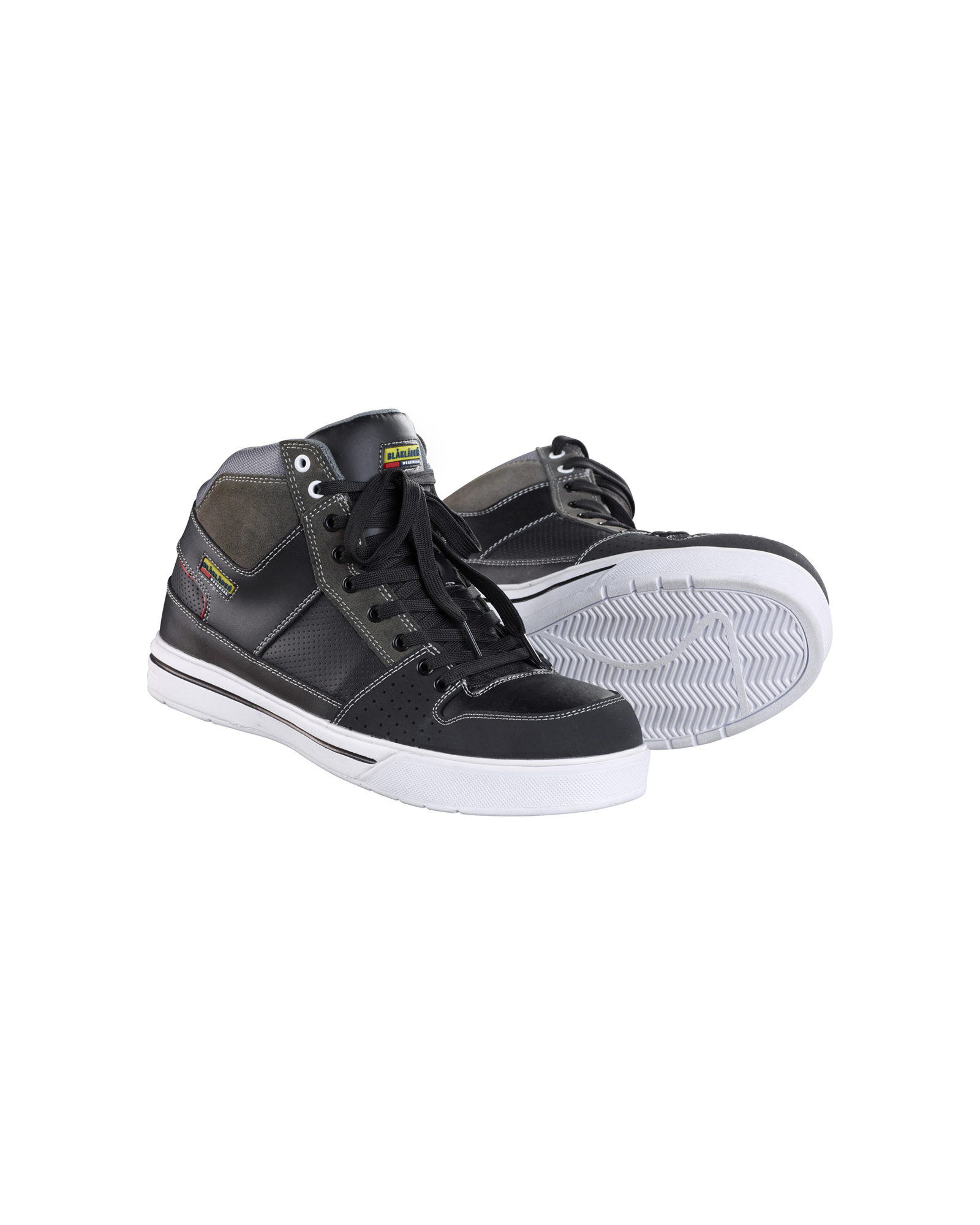 Asennetta työhön Blåkläderin uusilla sneaker -tyylisillä kengillä! Korkeavartisen turvakengän muotoilu on saanut vaikutteita surffi- ja skeittikulttuurista. Turvakengässä on alumiininen varvassuoja ja tekstiilinen naulaanastumissuoja. Päällinen on hengittävää nahkaa ja PU:ta, mikä päästää kosteuden ulos kengästä. Nitriilipohja antaa hyvän pidon liukkailla pinnoilla ja kuminen varvasosa lisää kengän kestävyyttä. Suojaluokka S1P SRC.
