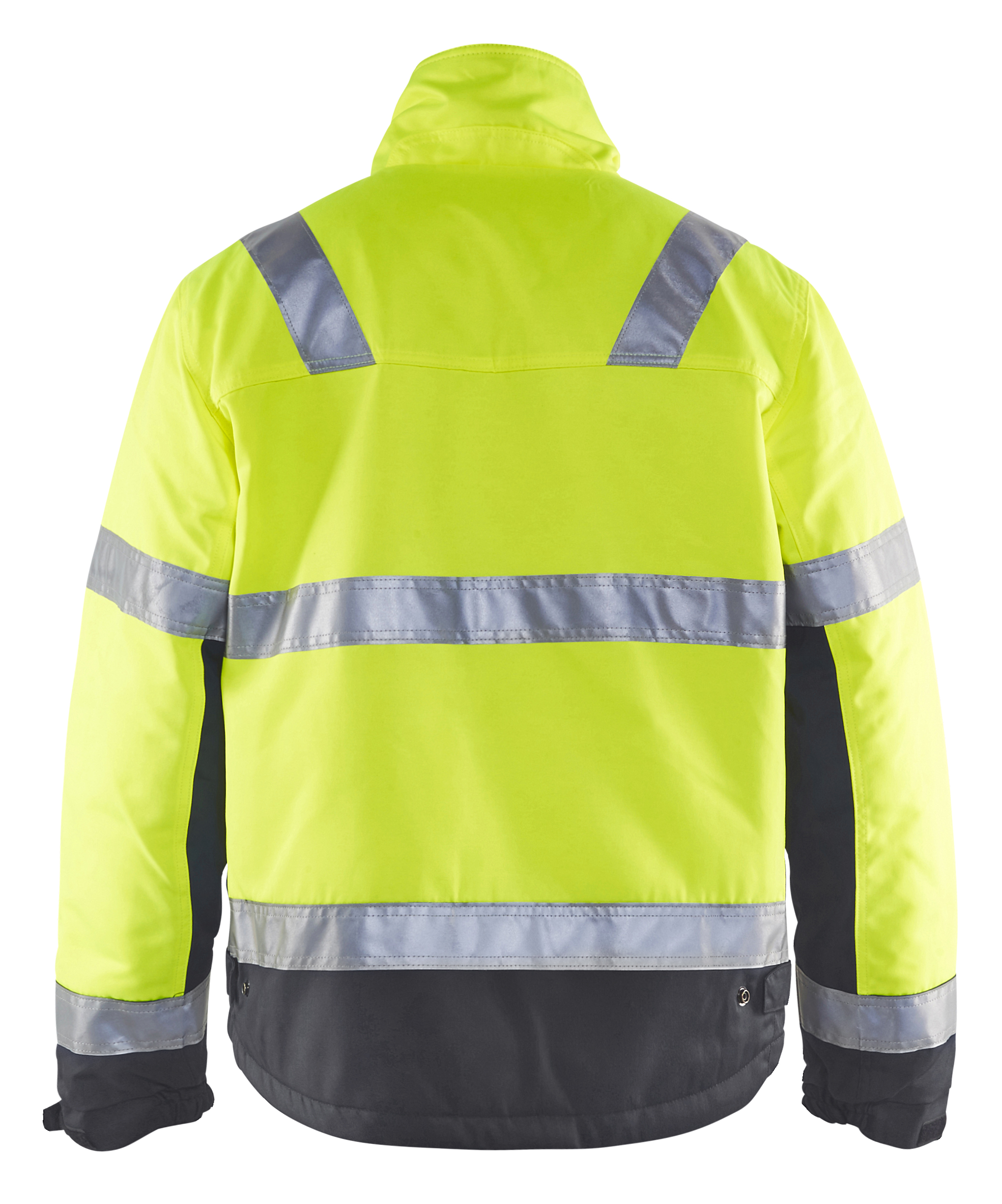 Tikkivuorellinen talvitakki kestävästä vettä- ja likaahylkivästä materiaalista. Tumma kangas on sijoiteltu helposti likaantuville alueille. Takissa on tilavat ja toimivat taskuratkaisut – etutaskut, rintatasku vetoketjulla, kynä- ja puhelintasku sekä povitasku takin sisäpuolella. Irrotettava ID-henkilökorttitasku. Säädettävä alareuna ja pidennetty selkäosa, joka suojaa alaselkää kylmältä ja viimalta. Sertifioitu EN ISO 20471 S-L luokka 2, XL-4XL luokka 3 (Näkyvä varoitusvaatetus ammattikäyttöön) ja EN 342 (Suojavaatetus kylmyyttä vastaan).
