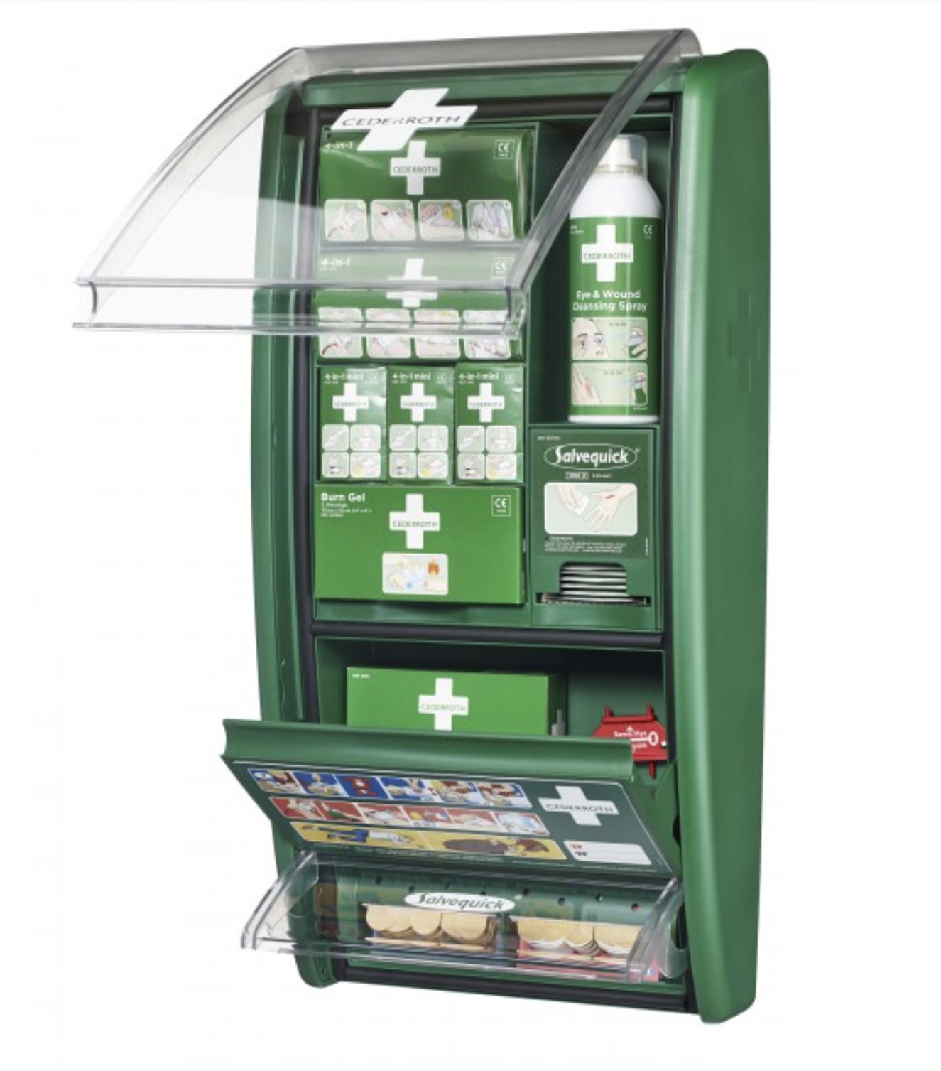 Uuden parannetun sisällön myötä voidaan hoitaa erityyppisiä vammoja ja tarvittaessa mukauttaa aseman sisältöä erilaisiin hoitotarpeisiin. Laastari- ja haavapyyheautomaatin täydennyspakkaukset ovat lukittuina automaateissa, mikä estää niiden hävikin.