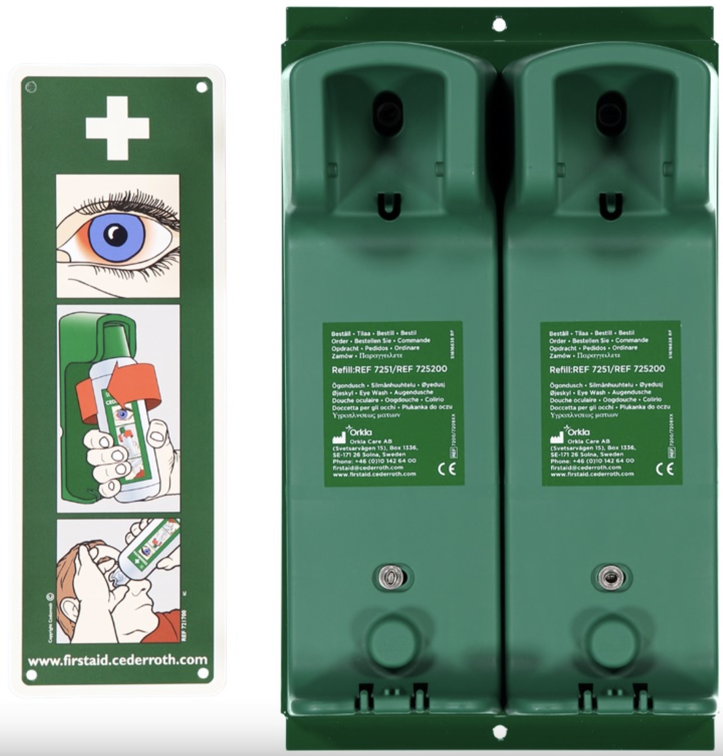 Käytännöllinen seinäteline kahdelle Cederroth silmänhuuhtelupullolle, 500 ml (REF 7251). Pullo on lukittuna telineessään ja avautuu automaattisesti, kun se kierretään irti – silmän huuhtelu voidaan aloittaa välittömästi.