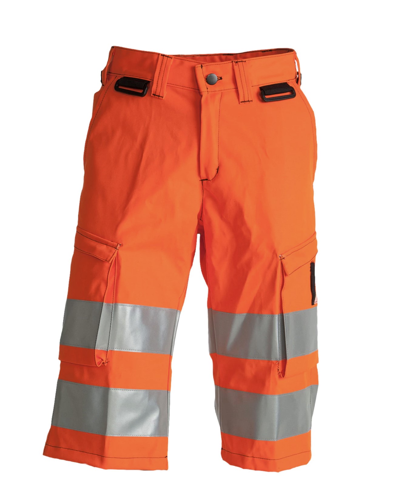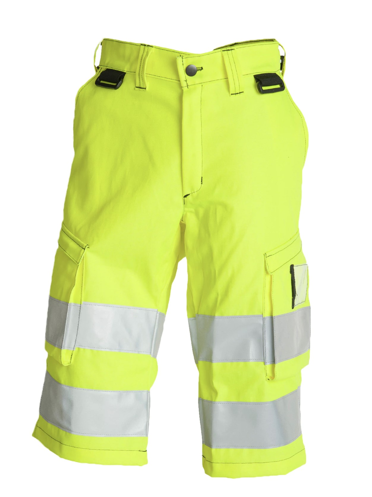 Standardi EN ISO 20471 lk 2. Reisitaskulliset polvimittaiset shortsit, joustava vyötärö, puhelintasku. Takana kannelliset paikkataskut.