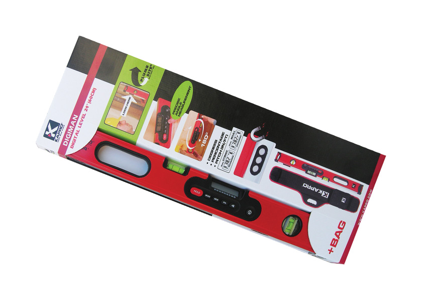 Digitaalinen vesivaaka, jonka avulla mittaat kätevästi eri kallistuksia tarkasti. Selkeälukuisesta taustavalaistusta digitaalisesta näytöstä voit helposti lukea mitattuja kulmia. Näytön lukema kääntyy myös ylösalaisin vesivaakaa käännättäessä. Vesivaaka voidaan myös asettaa antamaan äänimerkin, mikä mahdollistaa sen käyttämisen ilman digitaaliseen näyttöön katsomista! Suuren kädensijan ansiosta vaaka on helppo asettaa ja pitää erilaisilla pinnoilla.