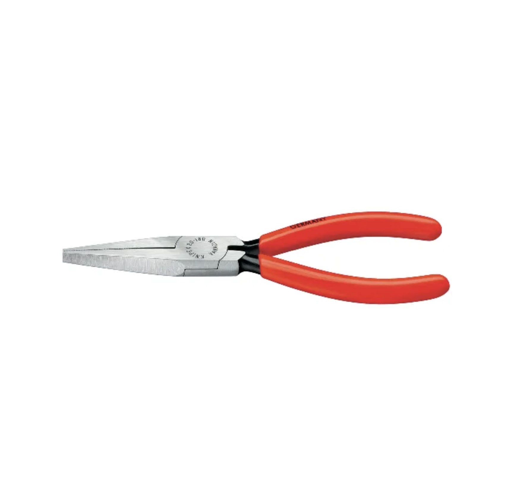 Kiiltävät yksiniveliset flakkapihdit, joissa on litteät leuat ja uritettu tartuntapinta. Flakkapihdeissä on myös muovipäällysteiset kahvat.