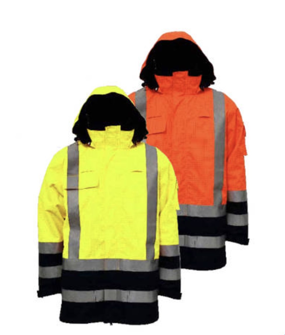 Palosuojattu, sekä tuulen- ja vedenpitävä huomiotakki.