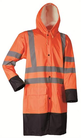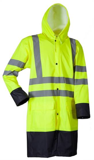 Varoitus sadetakki 100 cm. Kiinteä huppu jossa nauha, painonapit ja kaksi läpällistä etutaskua, vetoketju alkaen lantiosta ylöspäin, sekä painonappi hihansuussa.