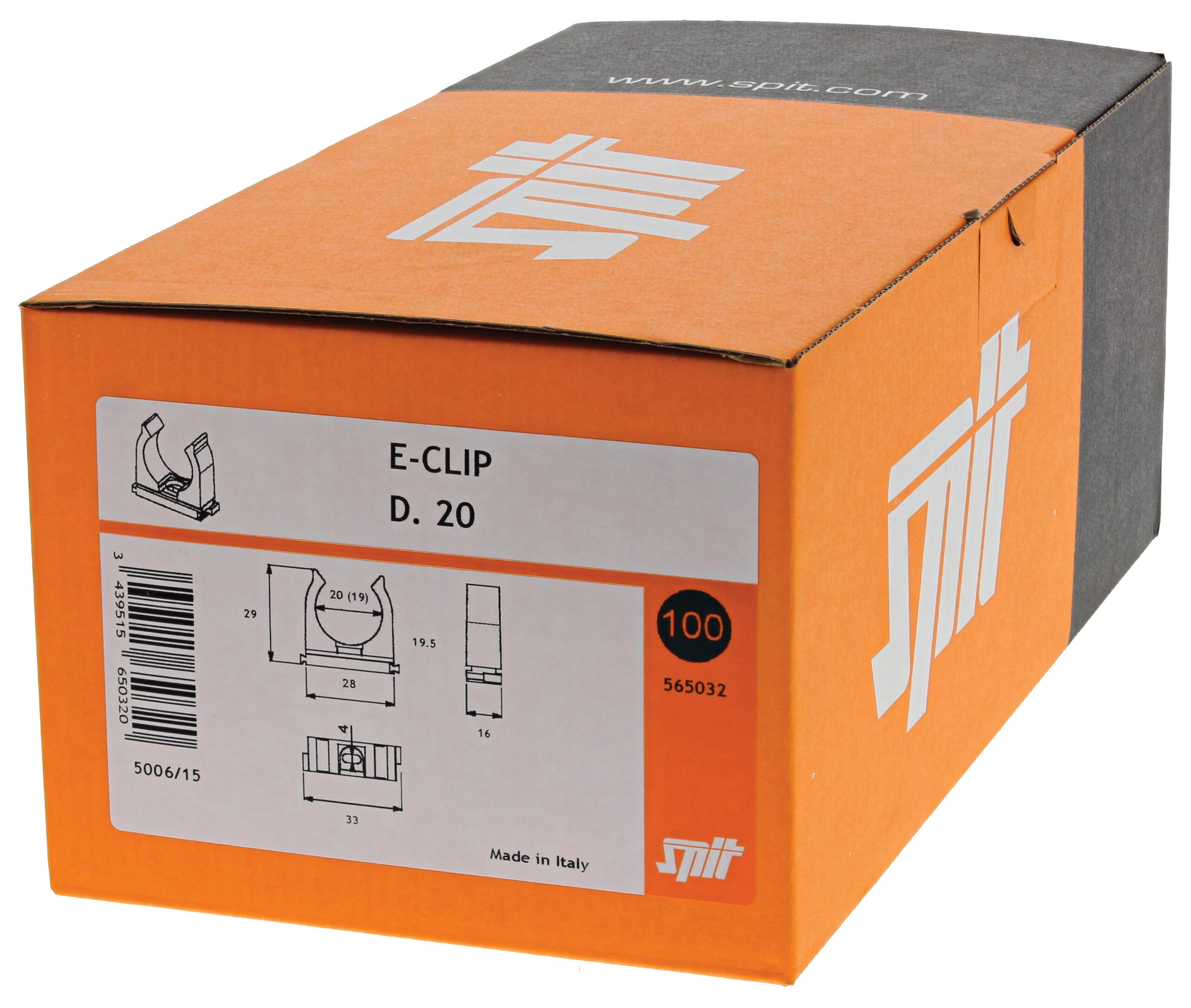 Tuotteet > Kiinnitys­tarvikkeet > PULSA E-CLIP 25MM PUTKIKANNAKE 100 KPL/RASIA SPIT