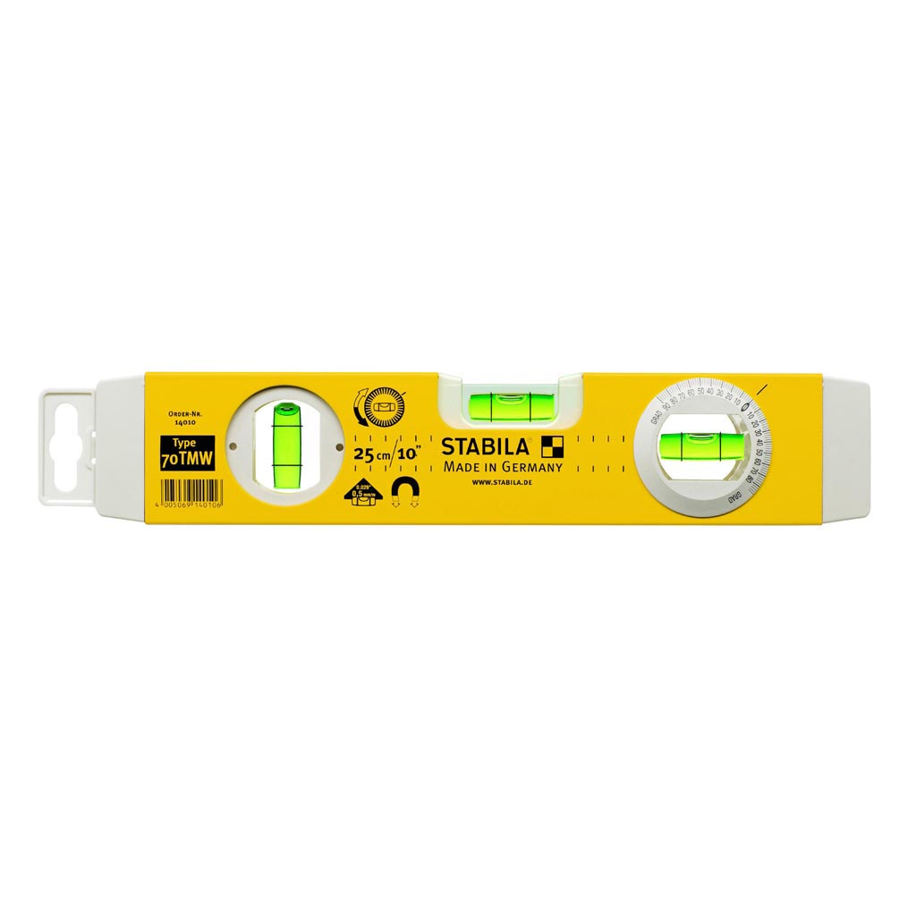STABILA Torpedo astevesivaaka 70TMW magneetilla. Kevyt, alumiinen profiili. Muoviset päätytulpat. Magneettinauha. 1 vaakalibelli ja 1 pystylibelli ja yksi säädettävä pystylibelli. Mittaustarkkuus normaalissa asennossa 0.5 mm/m (ei käänteistä asentoa).