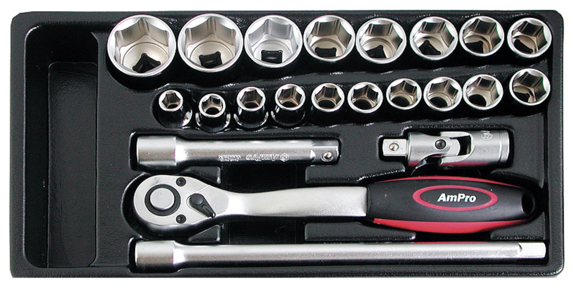 AmPron työkalusarja pakattuna muoviseen säilytyslaatikkoon. materiaali kromi-vanadium -terästä. Sarja sisältää: