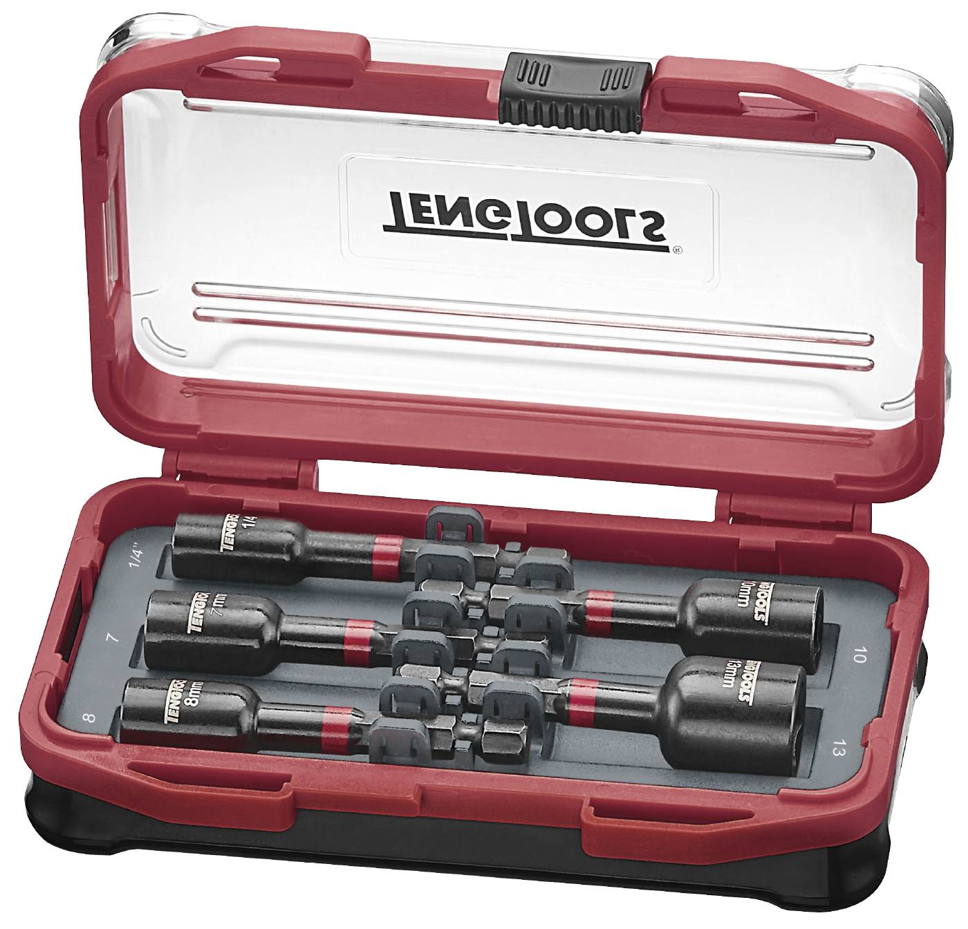 5-osainen ruuvinpidinsarja Impact. Magneettisten ruuvinpitimien pituus on 65 mm. Toimitetaan muovilaatikossa, jossa pikalukitus ja metallijousella varustetut saranat. Impact-ruuvinpitimet soveltuvat iskeviin ruuvinvääntimiin.