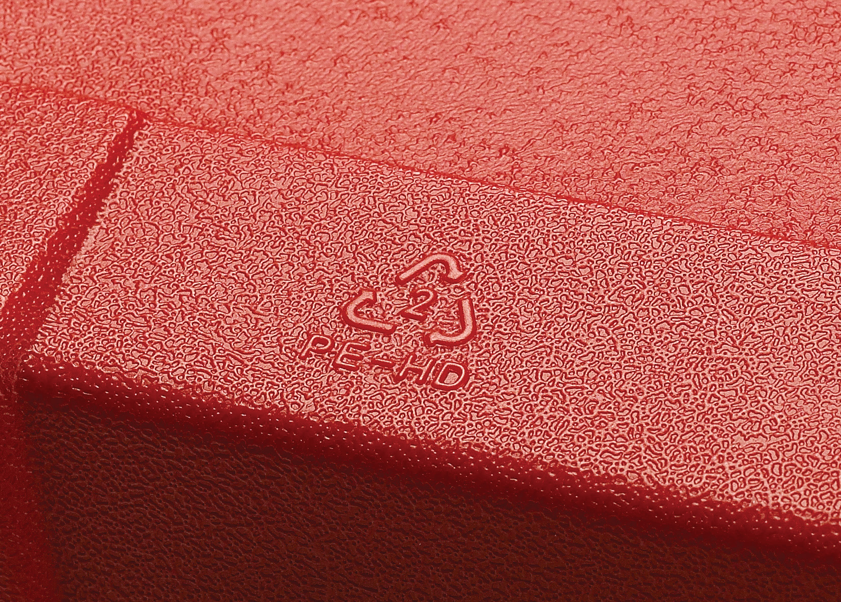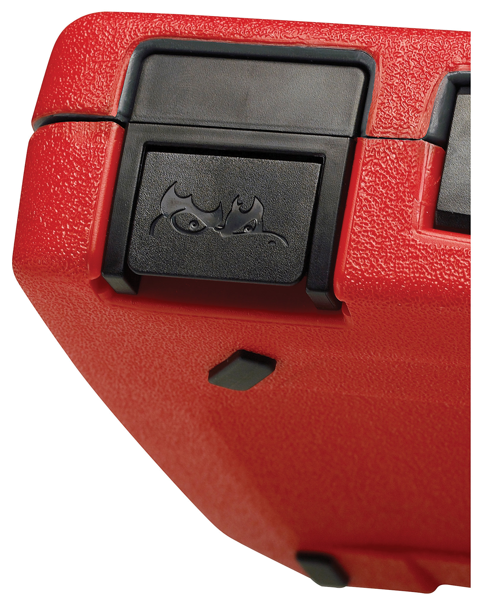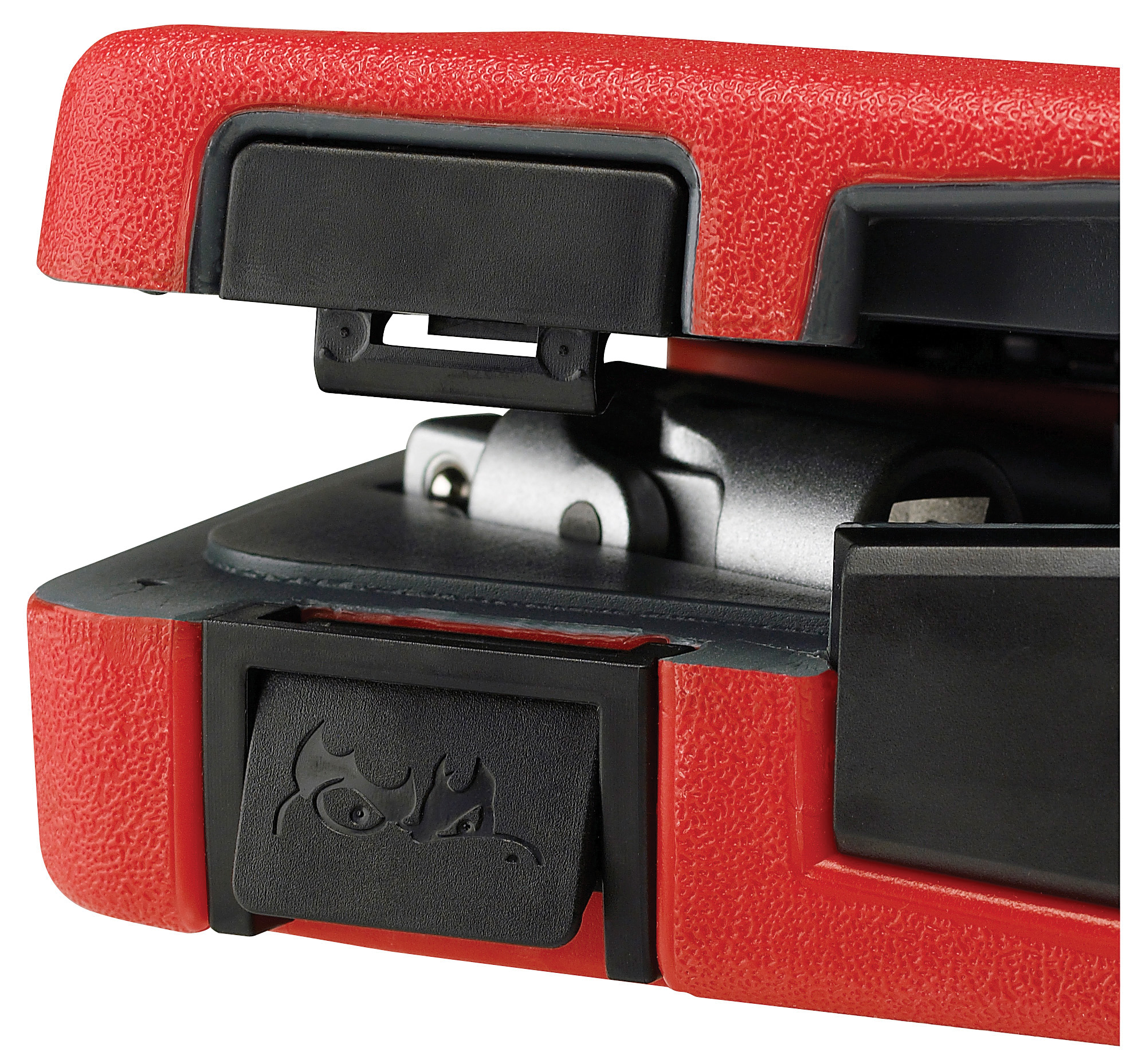 Punaisessa muovilaatikossa, jossa muovinen turvalukko, taittuva kahva ja saranat metallitapeilla. Laatikon alla on luistamisen estävät kumitassut.