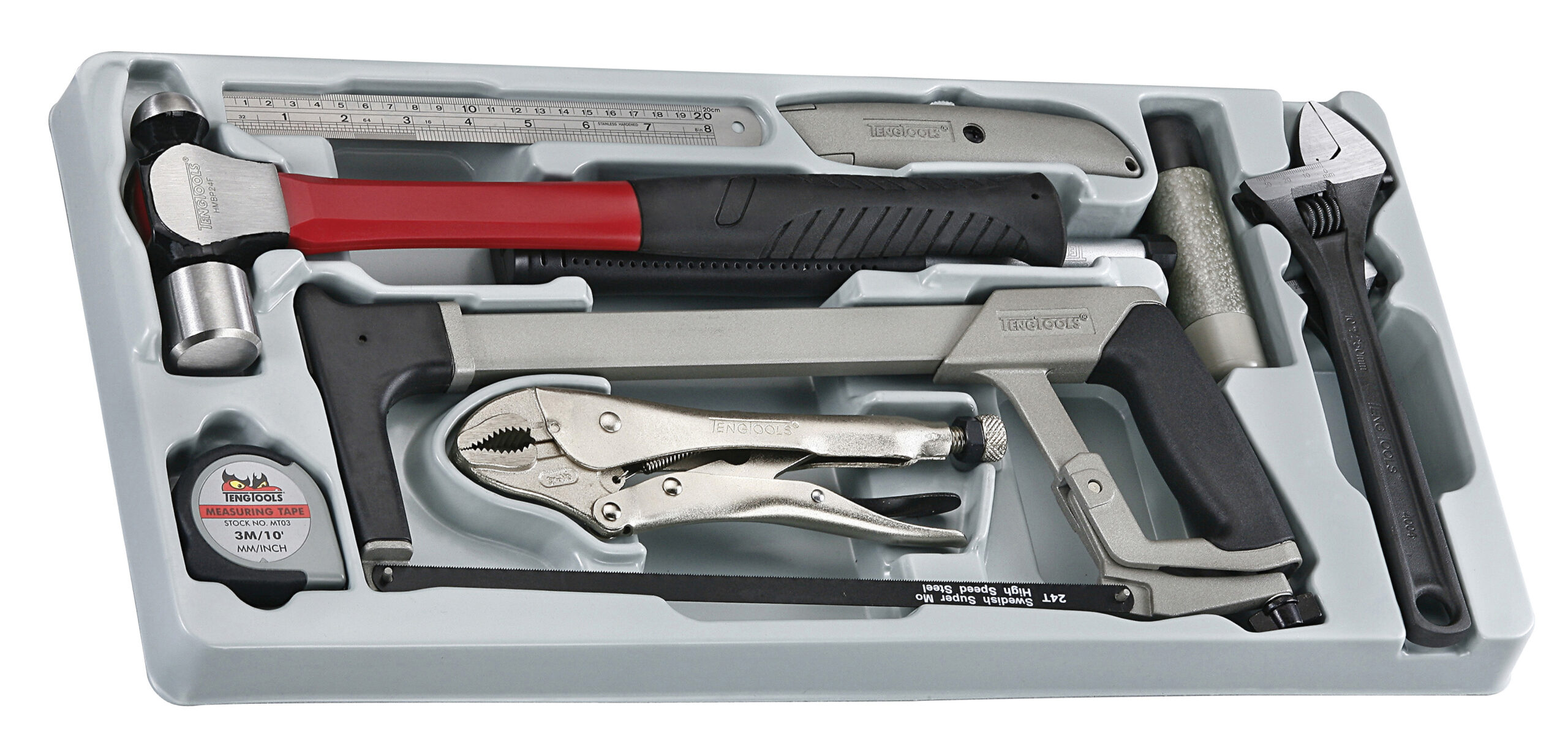 9-osainen työkalusarja: 2 jakoavainta, yleispihti, yleisveitsi, rautasahanrunko, muovivasara, mittanauha, teräsviivain ja pallopäävasara. Sopii Teng Toolsin työkalulaatikoihin ja asennusvaunuihin sopivassa lokerikossa.