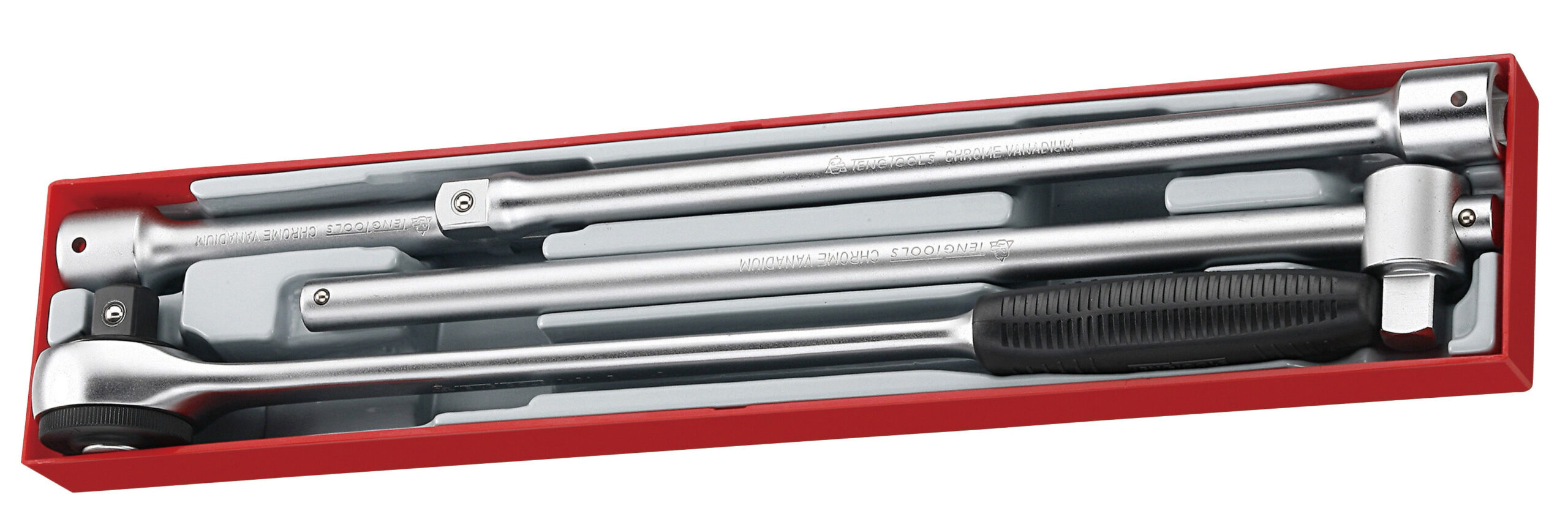 Teng Tools Sarjassa räikkäväännin suunnanvaihtovivulla ja irrotettavalla räikkäpäällä, kaksi pidennystankoa ja T-väännin. Kaikissa 3/4″-liitäntä. Teng Toolsin työkalulaatikoihin ja asentajanvaunuihin sopivassa laatikossa.