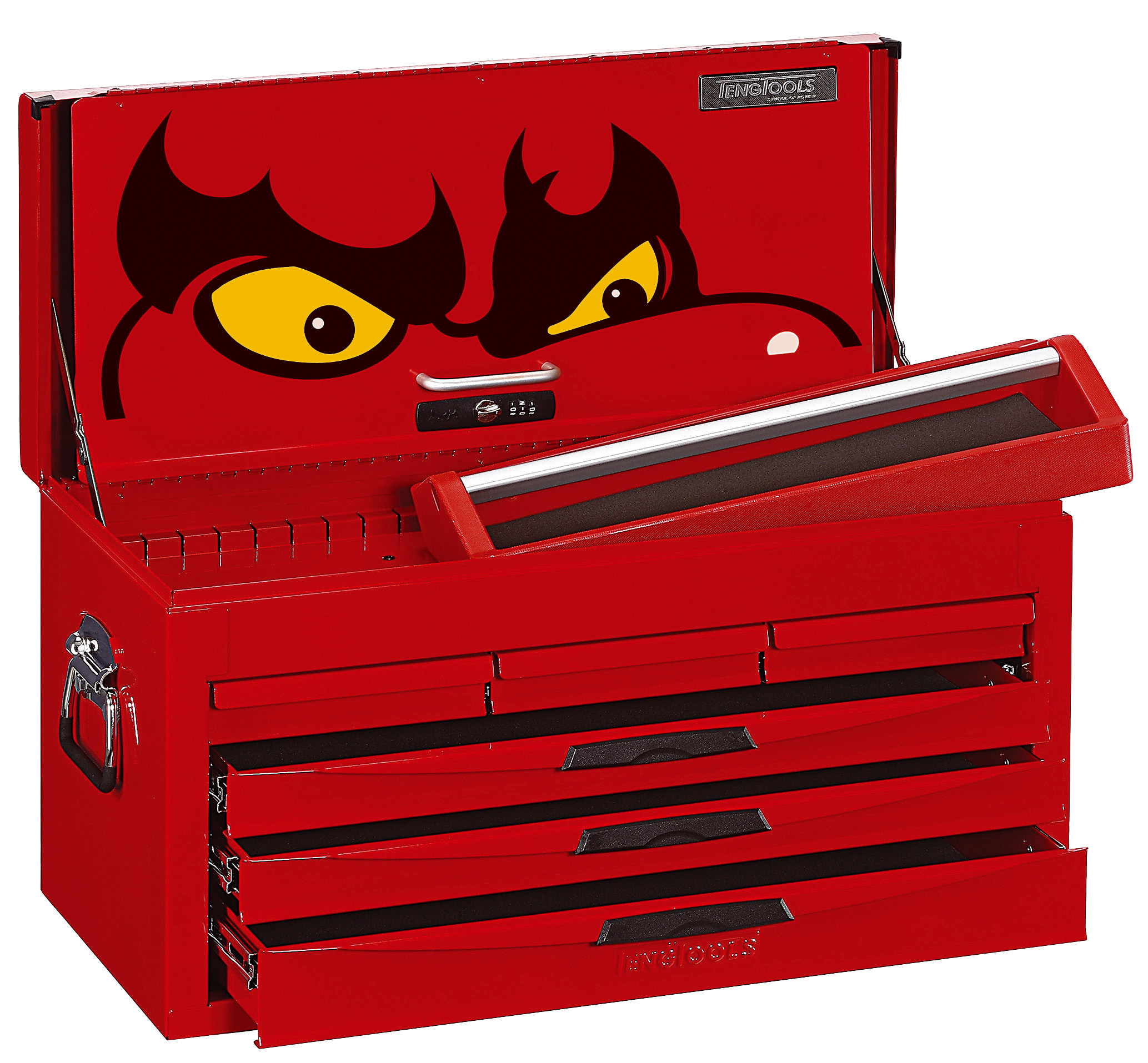 Teng Tools Punaiseksi maalattua teräslevyä. 6 ulosvedettävää, kuulalaakeroitua laatikkoa ja irrotettava ylälaatikko alumiinikahvoilla. Lukittava kansi/etulevy joka peittää ulosvedettävät laatikot. Mukana yhdistelmälukko. Päädyissä tukevat kantokahvat.