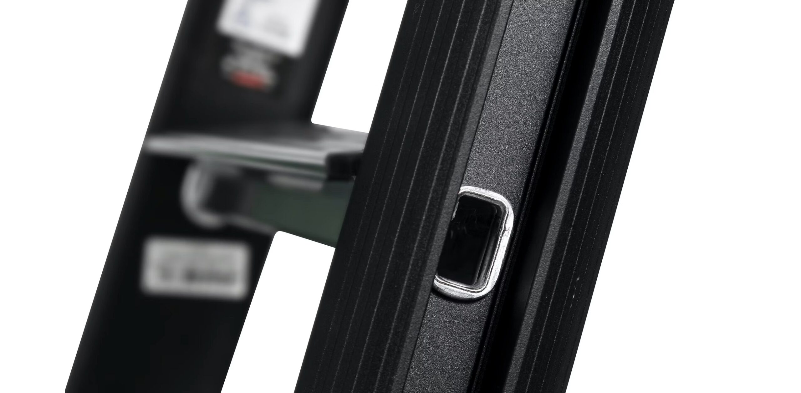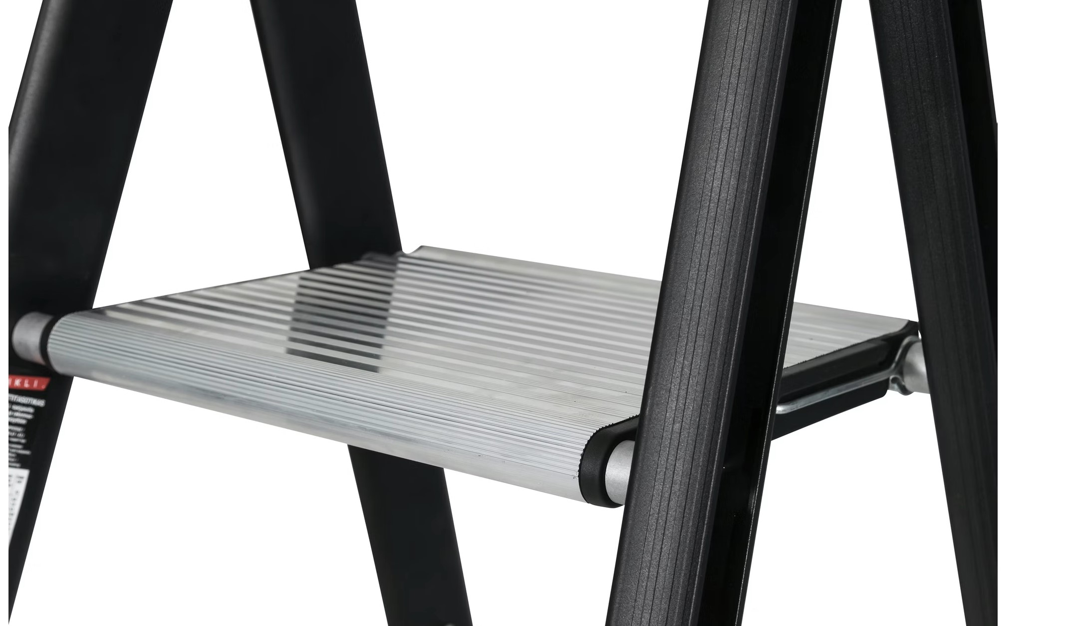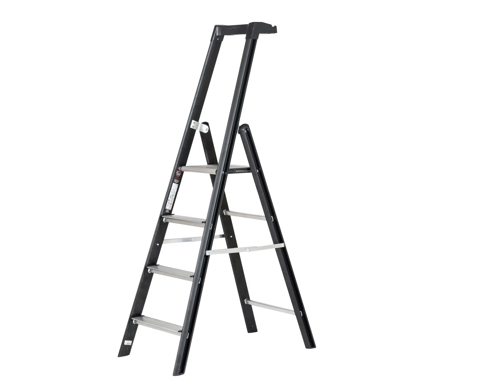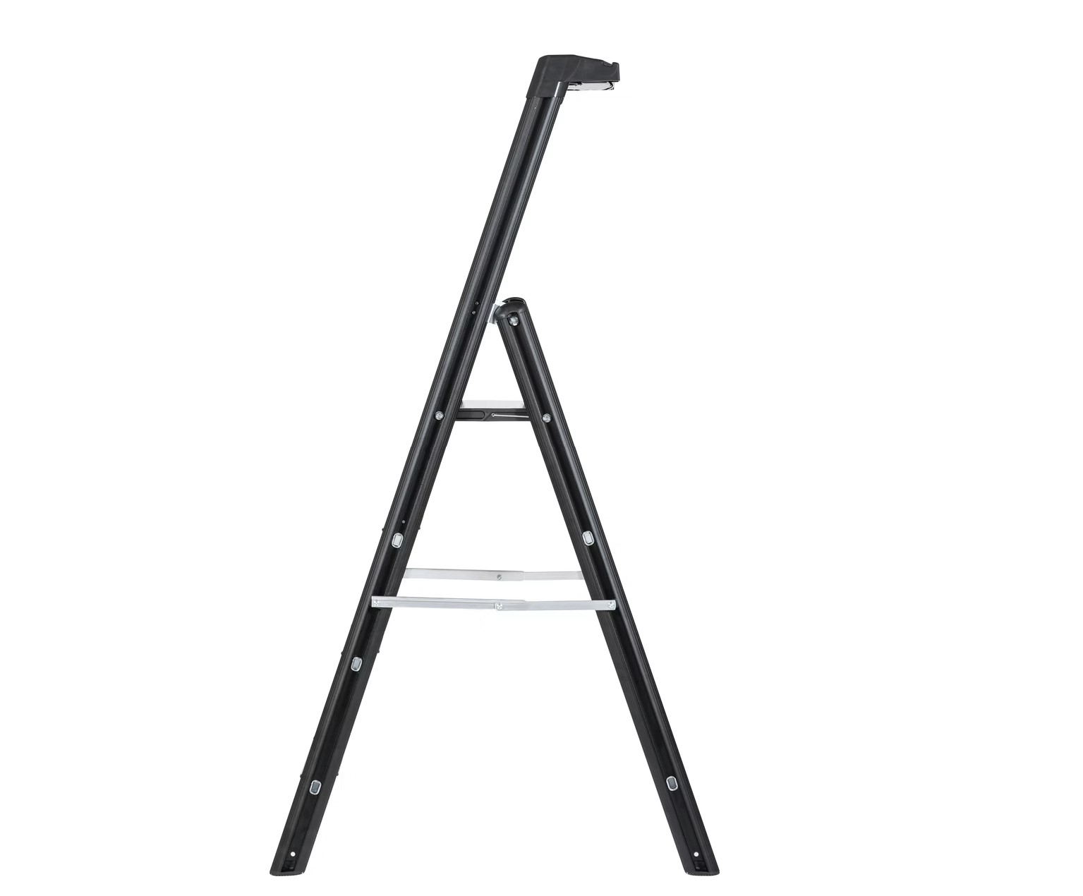 Sivuprofiilien muotoilu ja musta struktuurimaalipinta tekevät tikkaasta miellyttävän käyttää. Uudistettu työkalukotelo, korkeampi polvituki, suuri alumiininen seisontataso 300 x 250 mm, metallirajoittimet ja luja askelmakiinnitystekniikka tuovat turvallisuutta työskentelyyn.